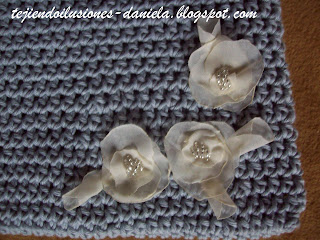 Simple, tejida en medio punto con hilo grueso color gris, con flores en gasa y detalle de mostacillas en el centro ; para cerrar un botón transparente.